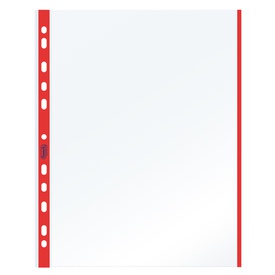 Busta forata con banda rossa realizzata in Naturene (polipropilene) trasparente a buccia d'arancia. Foratura universale con banda di rinforzo e bordo colorato per un'immediata identificazione. Formato 21x29,7cm. Made in Italy Marca Favorit