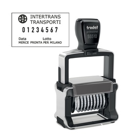 Timbro numeratore autoinchiostrante. Design moderno ed ergonomico con robusta struttura in acciaio. Bande con numeri da 0 a 9 e simboli. 8 colonne da 5mm. Piastra di stampa 56x33mm. Tampone di ricambio 6/56. Marca Trodat