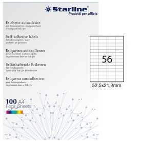 Etichette adesive bianche STARLINE utilizzabili con stampanti laser, inkjet o fotocopiatori. Adesivo permanente. Dotate di margine di sicurezza lungo tutto il perimetro. In scatola da 100 fogli formato A4. Caratteristiche di questo articolo: • Codice: S Marca Starline