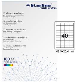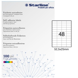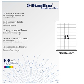 Etichette adesive bianche STARLINE utilizzabili con stampanti laser, inkjet o fotocopiatori. Adesivo permanente. Prive di margne di sicurezza lungo il perimetro. In scatola da 100 fogli formato A4. Caratteristiche di questo articolo: • Codice: STL3017 • Marca Starline