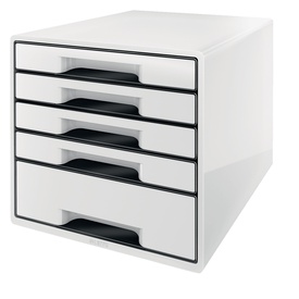 Cassettiera Black & White da 5 cassetti: 4 cassetti poco profondi + 1 cassetto alto per accessori da scrivania, come cucitrice, dispositivi mobili, ecc. Cassettiere impilabili fino a 3 moduli. Ergonomico buco presa nella parte inferiore del cassetti poco Marca Leitz
