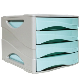 Cassettiera a 4 cassetti per documenti (A4, A4+ o 24x32 cm), struttura monoblocco, resistente e ultrarigida. Realizzata con plastica riciclata proveniente dai rifiuti domestici e quindi certificata Blue Angel. Dimensioni (PxlxAlt) 347x278x267 mm Marca Exacompta