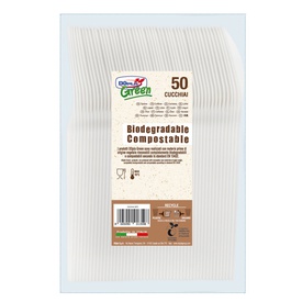 Cucchiai di colore avorio in Estabio compostabile e biodegradabile in conformità alla norma EN 13432. Per alimenti Max 70°C. • Lunghezza 180mm • Peso unitario 5,7gr • Compostabili e biodegradabili Marca Dopla