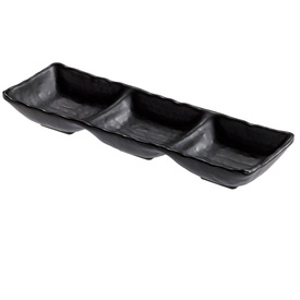Vassoio a 3 scomparti in melamina nera, 27x9x3,5 cm. Peso netto 210gr. Capacità: 90ml +90ml+90ml Colore Nero. 100% Melamina, prodotto idoneo al contatto con tutti i tipi di alimenti (T max70°C). Articolo lavabile in lavastoviglie; Da non utilizzare con ut Marca Leone