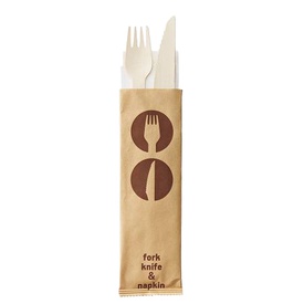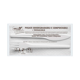 Bis posate (coltello e forchetta) di colore avorio in Estabio compostabile e biodegradabile in conformità alla norma EN 13432. Per alimenti Max 70°C. • Lunghezza posate 180mm • Tovagliolo a 2 veli 33x33cm • Compostabili e biodegradabili Marca Dopla
