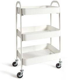 Carrellino in metallo verniciato bianco con 4 ruote girevoli e 3 ripiani. Ideali in cucina, bagno, lavanderia ecc. Si assembla velocemente senza bisogno di attrezzi. Dimensioni: L43 x P30 x H80cm. Marca Perfetto