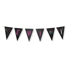 Festone formato da 14 bandierine lavagna (formato 22x15cm ciascuna), ideali per personalizzare la festa con messaggi sempre nuovi e divertenti. Fornito con pennarello a gesso liquido e filo da 4 metri. Marca Securit