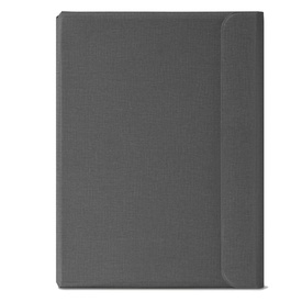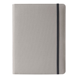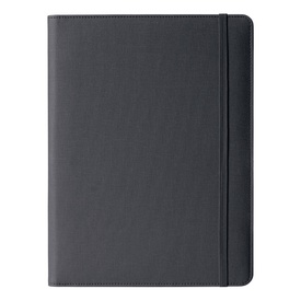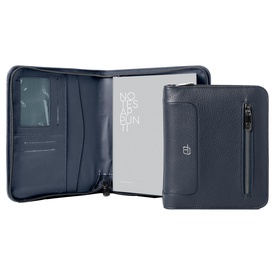 Portablocco in tessuto tecnico e chiusura in ecopelle. Formato A4 chiusura con zip, tasca esterna con chiusura a bottone, scomparti per biglietti, tasca interna portadocumenti, portapenna, completo di blocco. Dimensioni: 25x33,5cm.