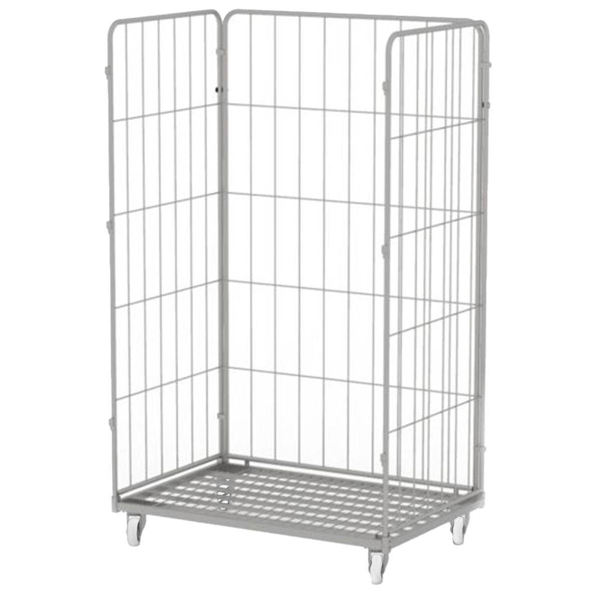 Carrello Roll Container con 3 sponde laterali, in filo zincato, 4 ruote nylon 10cm, 2 fisse e 2 girevoli. Portata 500kg. Dimensioni:120Lx80Px198Hcm. Fornito smontato.