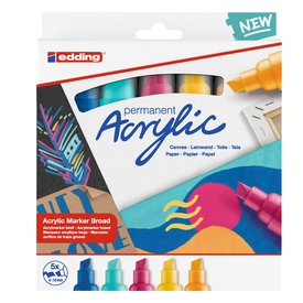 Colori acrilici di alta qualità in un pratico marcatore. Garantisce una elevata coprenza, colori brillanti, tenuta permanente, rapida asciugatura, resistenza all'acqua e luce, inodore. Adatto a supporti come tela e carta. Set da 5 marcatori punta largo in Marca Edding Gruppo statistico PERMANENTI