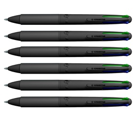 Astuccio in poliuretano nero con elegante finitura SOFT TOUCH contenente 6 penne a scatto con punta a sfera da 1mm. Inchiostro nei colori blue, nero, rosso e verde. Fusto ALL BLACK con finitura gommata. Marca Osama