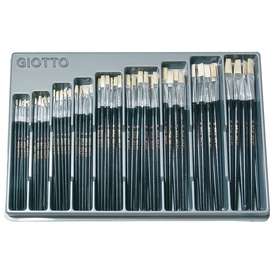 Pennello per olio, manico legno naturale verniciato nero, punta piatta in setola. Vetrinetta contenente: 20 pz del numero: 0,2,4. 14 pz del numero: 6,8,10. 8 pz del numero: 12,14,16. Marca Giotto
