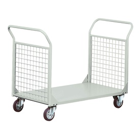 Carrello con pianale in lamiera e 2 sponde in tubo e rete con maglia 5x5x0,4cm, ruote 14cm con cuscinetti a rulli, 2 fisse e 2 girevoli. Portata 300kg. Verniciatura a polvere grigio RAL 7038. Dimensioni carrello: 138Lx66Px20/96Hcm. Dimensioni pianale: 110