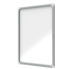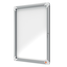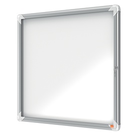Ad anta battente. Moderna, sicura e resistente all'umidità. Nuovo design con robusta cornice in alluminio e vetro di sicurezza di 4mm. waterproof to iec 60529. Fondo in acciaio bianco magnetico per uso con magnetini o scrivibile con pennarelli a secco. Fi Marca Nobo