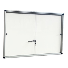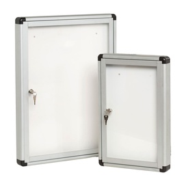 Ad anta battente. Moderna, sicura e resistente all'umidità. Robusta cornice in alluminio e vetro di sicurezza da 4mm. Fondo in acciaio bianco magnetico e scrivibile con pennarelli a secco. Fissaggio semplice effettuabile da una sola persona. Serratura con Marca Nobo