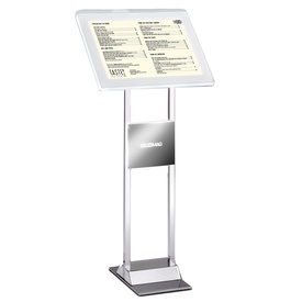 Comodo e pratico leggio da interno con cornice LEDMAG retroilluminata a LED formato A4 verticale/orizzontale. Piantana in acciaio metalizzato, alimentatore interno da 40w. H 110cm; P 40cm. Ideale per ristoranti, sale riunioni, agenzie, spazi espositivi in Marca Tecnostyl Gruppo statistico Leggii