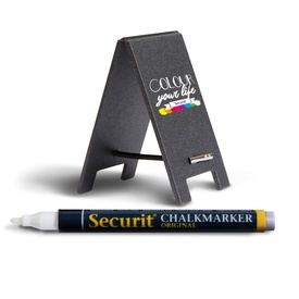 Mini lavagnette da tavolo con cavalletto scrivibili e cancellabili. Realizzate in PU facile da pulire e resistente ai raggi UV, a graffi e urti. Fornite con 1 pennarello a gesso liquido bianco. Marca Securit
