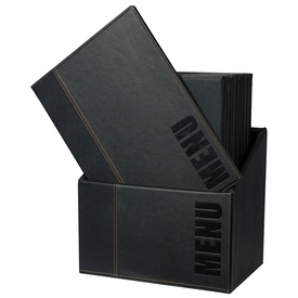 Scatola contenitore in similpelle con 20 porta menù a 4 linea Trendy (ad 1 inserto). Soluzione ideale per tenere i menù sempre in ordine e pronti all'uso! Dimensioni: 37 x 29 x 21cm. Può contenere fino a 10 inserti doppi per un totale di 40 facciate. Marca Securit Gruppo statistico PORTA MENU' e ACCESSORI